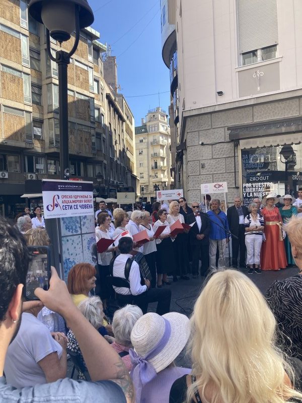 The program included discussions between doctors and elderly citizens about dementia risk factors, a public survey, and the distribution of educational materials on prevention and patient support. There was also an entertainment segment titled “Games and Songs for Memory,” featuring performances by members of the “Bread of Life” folklore group, the Jeleče ensemble from New Belgrade, and the choir of female students from the Faculty of Music in Belgrade.