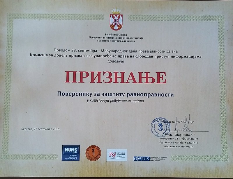Повереник за заштиту равноправности добитник је признања у категорији републичких органа, а које поводом обележавања Међународног дана права јавности да зна, додељује Повереник за информације од јавног значаја и заштиту података о личности у сарадњи са Мисијом ОЕБС-а.